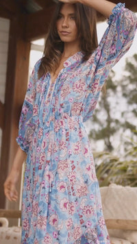 Discover true effortless style with the Jasmine Midi Dress Keilani Print. This stunning high low dress boasts a beautiful yoke neckline, romantic puffed sleeves, and a flattering elastic waistline. Embrace the billowy silhouette and feel confident in every step, perfect for any occasion.