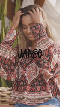 This divine new boho top by Jaase in the gorgeous Aisha print is perfect to just slip on with denim shorts or jeans. A blouse style top that is perfect all year round, featuring;