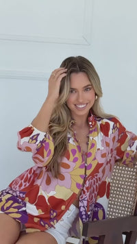 Stay cool in style with the Oslo Blouse. Crafted from a lightweight cotton and nylon blend fabric, in a stunning Pink, Rust, Marigold, Purple and White floral print, this summer staple features a high neck with fabric covered buttons all the way down to style it how you like. Wear it more open for a v-neck style or done up, it's the perfect way to add a hint of style and sophistication to your wardrobe!