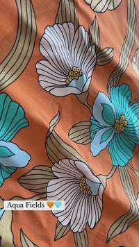 In a heart stopping exclusive floral fabric designed by Australian Artists, in hues of burnt orange, aqua, beige and white, this print is to die for!