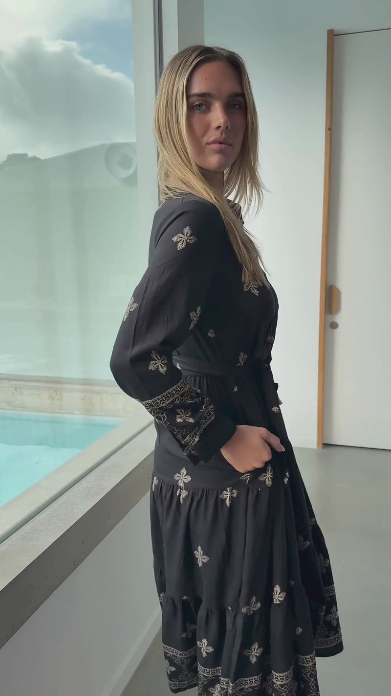Unleash your inner romantic with our Cairo Midi Tie Dress in Black and Beige Print. This vintage-inspired essential features a black background with vintage print in beige. The fitted button down shirt shape and long button cuff sleeves add effortless style to your look. Embrace the beauty of the past and make a statement with this one-of-a-kind piece!